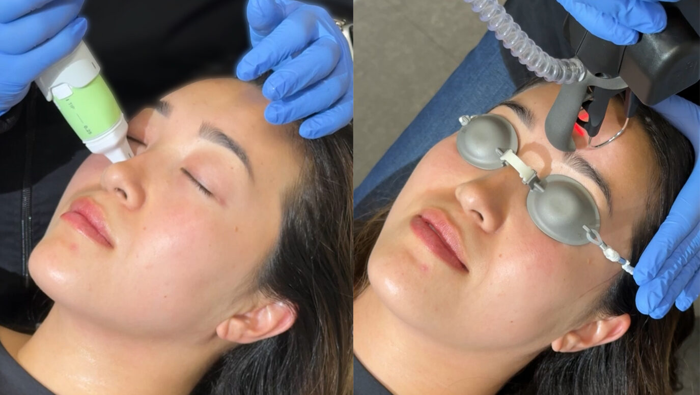 Client receiving CoolPeel CO2 laser facial treatment for skin rejuvenation at facial spa